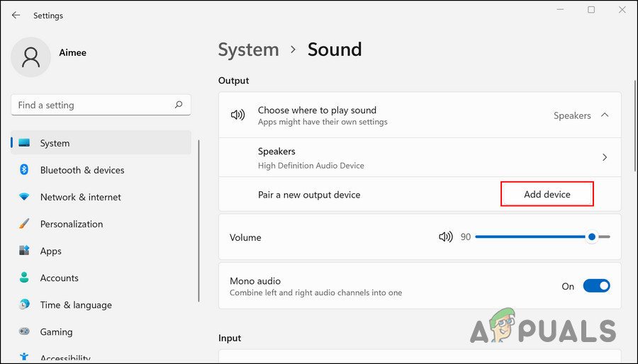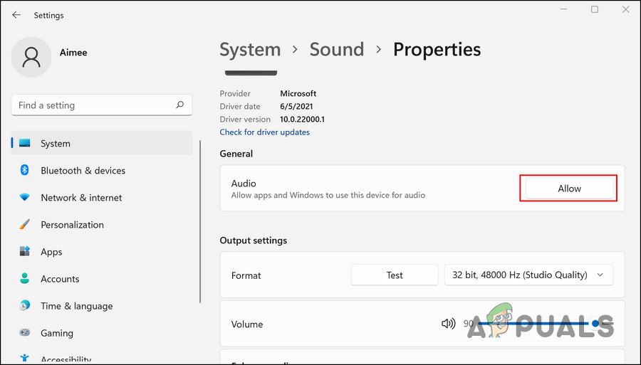 Allow button - If you cannot locate your audio device, click on the Add device button in the Output section of Sound settings.
