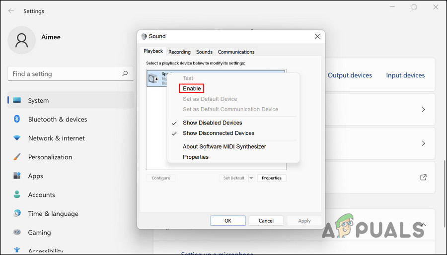 - Head over to the Playback tab and locate your targeted device. If you cannot find it, enable the Show disabled devices option.
