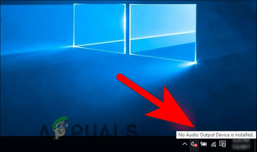 The ‘No audio output device is installed’ error is accompanied by a red cross on the speaker icon in the taskbar, preventing users from using the system sound. You can see the error message upon hovering the cursor over the cross on the sound icon.