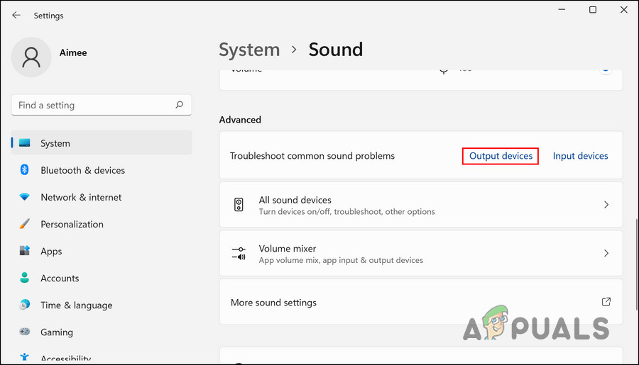 - Now, scroll down to the Advanced section and click on Output devices next to the Troubleshoot common problems option.