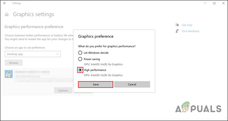6. Select High performance and select Save. You can now try launching the game and see if the problem is fixed.