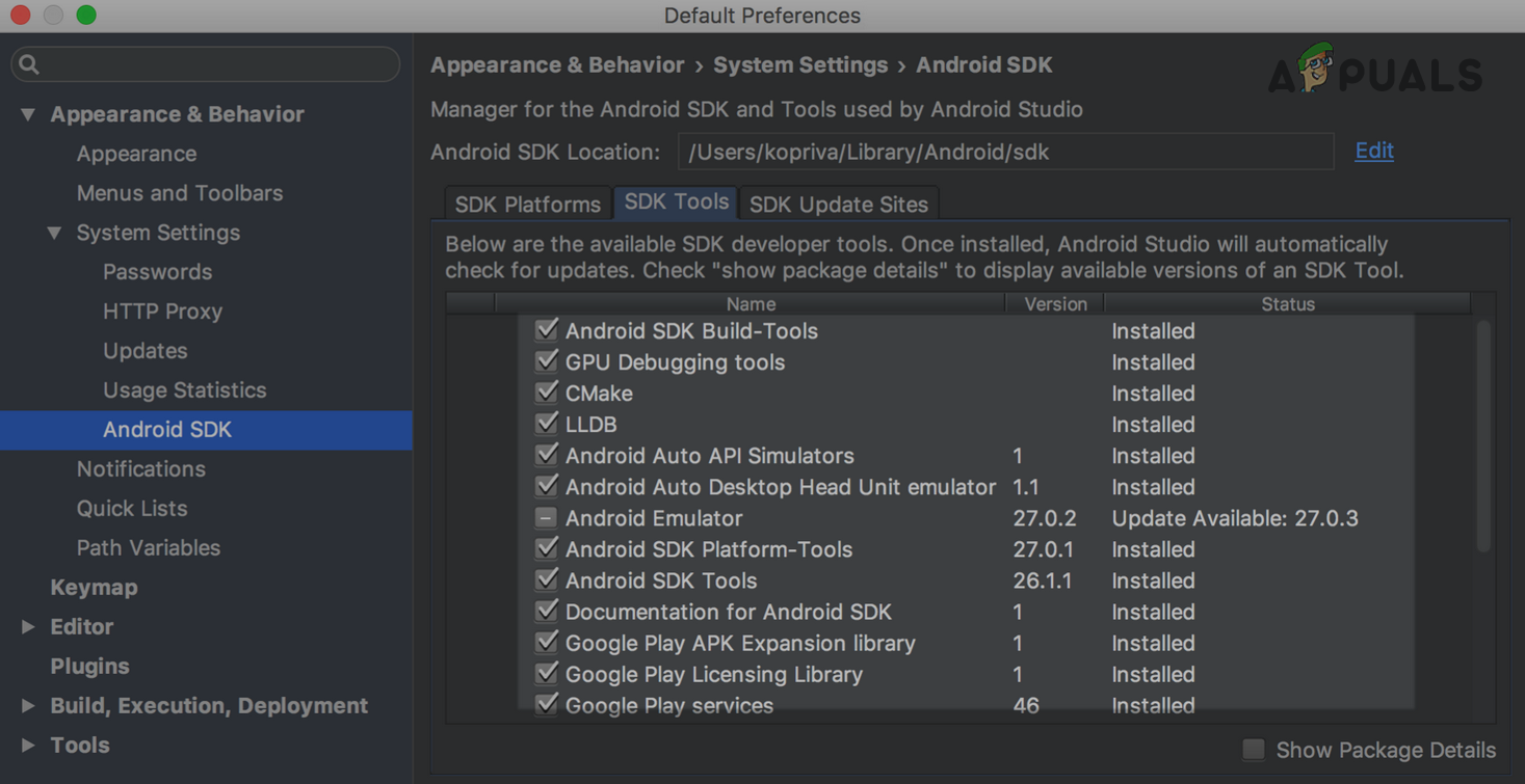 - If not, again head to the System Settings tab of the Android Studio Settings and in the left pane, select Android SDK.