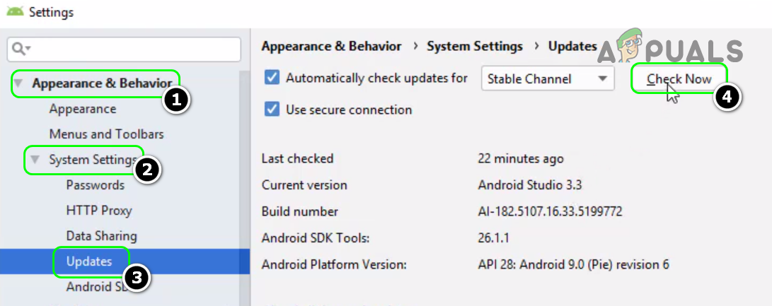 Open Android Studio’s Settings - Then expand System Settings and head to the Updates tab.
