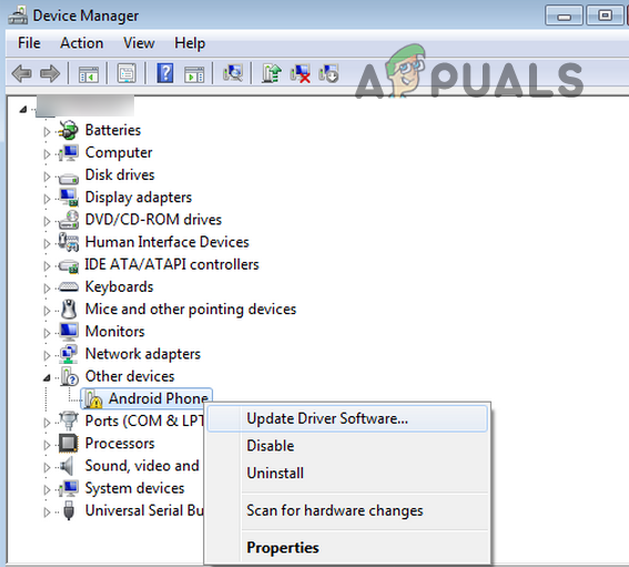 - If this doesn’t work, right-click on the Android device in the Device Manager and select Update Driver.