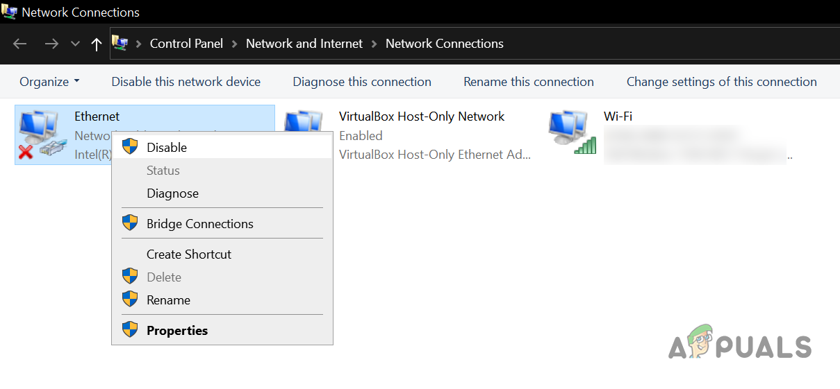 Disable Ethernet Adapter in Network Connections - Now restart the Android Studio and check if the ADB error 10061 is cleared.