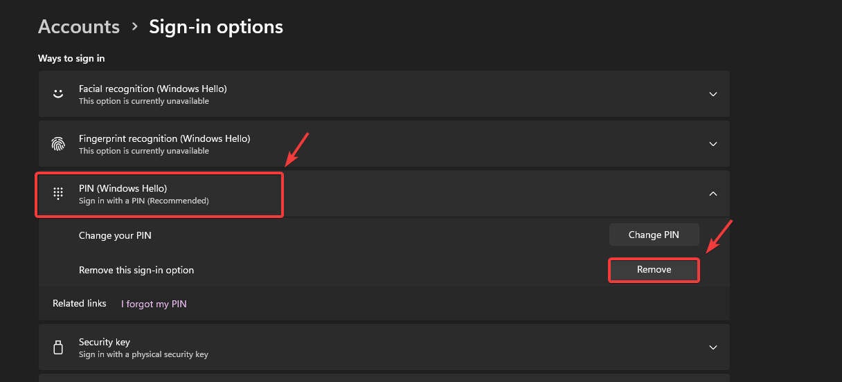 - Under the PIN (Windows Hello) section, click Remove and confirm the action.