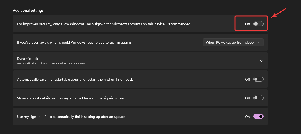 - If the Remove option is disabled, scroll down to the additional settings and toggle off the following option: For improved security, only allow Windows Hello sign-in for Microsoft accounts on this device (Recommended).
