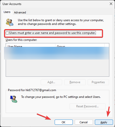 - Uncheck the box next to Users must enter a user name and password to use this computer.