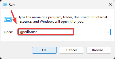 - Type gpedit.msc and click OK to open the Group Policy Editor.