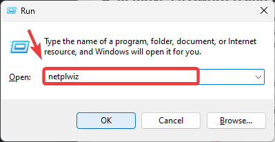 - Type netplwiz in the input box and click OK to open the User Accounts window.