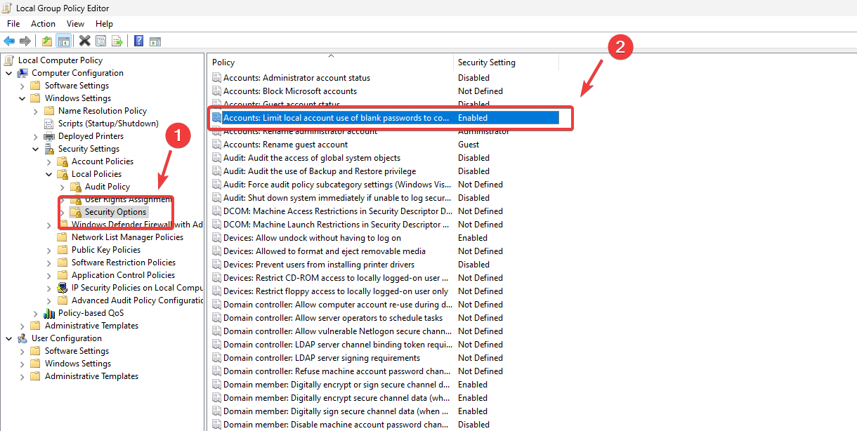 - Navigate to the following directory: Computer Configuration > Windows Settings > Security Settings > Local Policies > Security Options