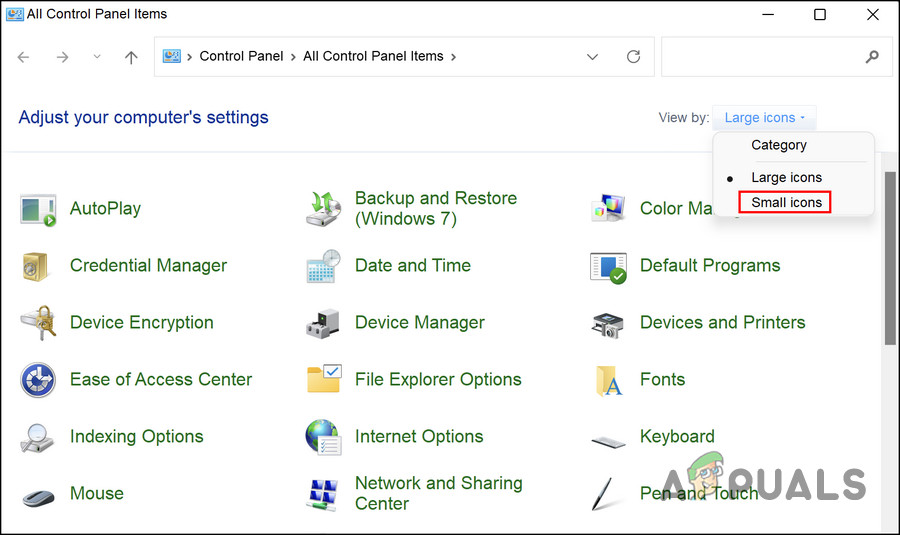 - In the Control Panel window, change the View by category to Small icons.