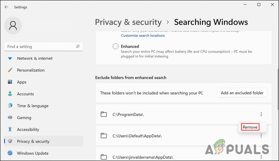 Choose the Searching Windows option - Scroll down to the Exclude folders from the enhanced search section and look for the targeted folder.