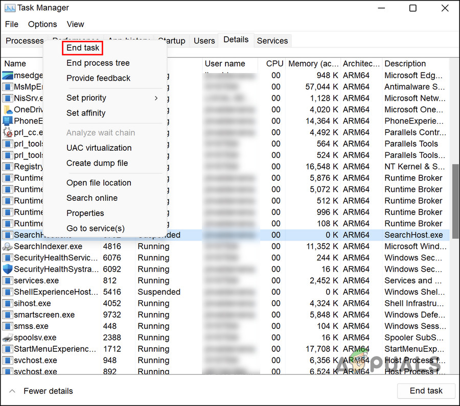 - Right-click on SearchUI.exe and choose End task.