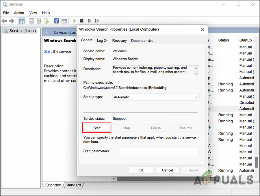 Start the Windows search service - Make sure the Startup type is set to Automatic.