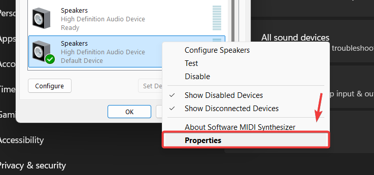 - In the Sound window, go to the Playback tab, right-click your default Speakers device, and select Properties.