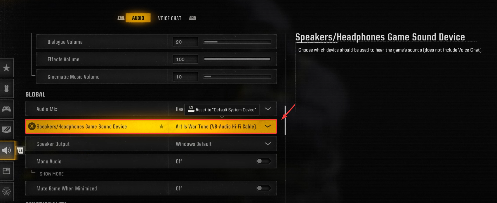 - Scroll to Speakers/Headphones Game Sound Device and select your preferred audio output (for example, headphones, speakers, or a soundbar) from the dropdown menu.