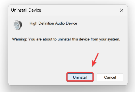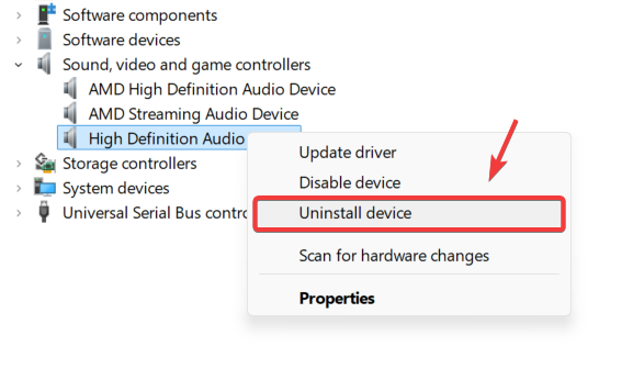 - Right-click on your audio device (e.g., Realtek High Definition Audio, Conexant Audio, or your specific hardware) and select Uninstall Device.