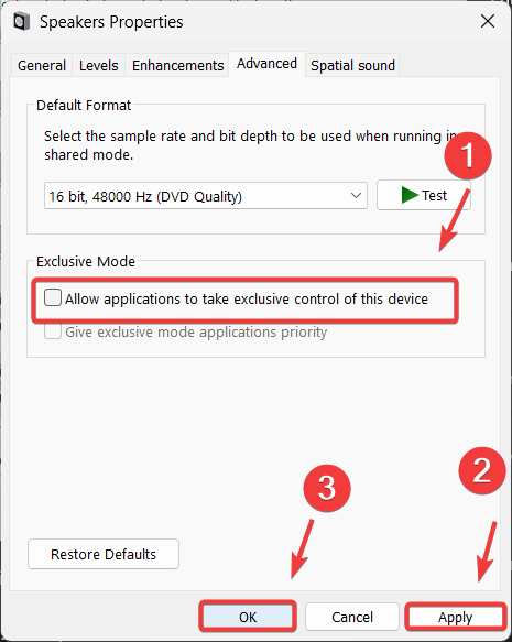 - Switch to the Advanced tab and uncheck the box next to Allow applications to take exclusive control of this device.