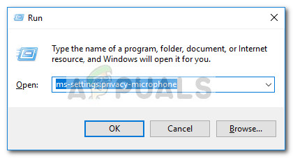 - Press Windows key + R to open up a Run dialog box. Next, type ‘ms-settings:privacy-microphone’ and press Enter to open up the Microphone Privacy window fo the Windows Settings app.