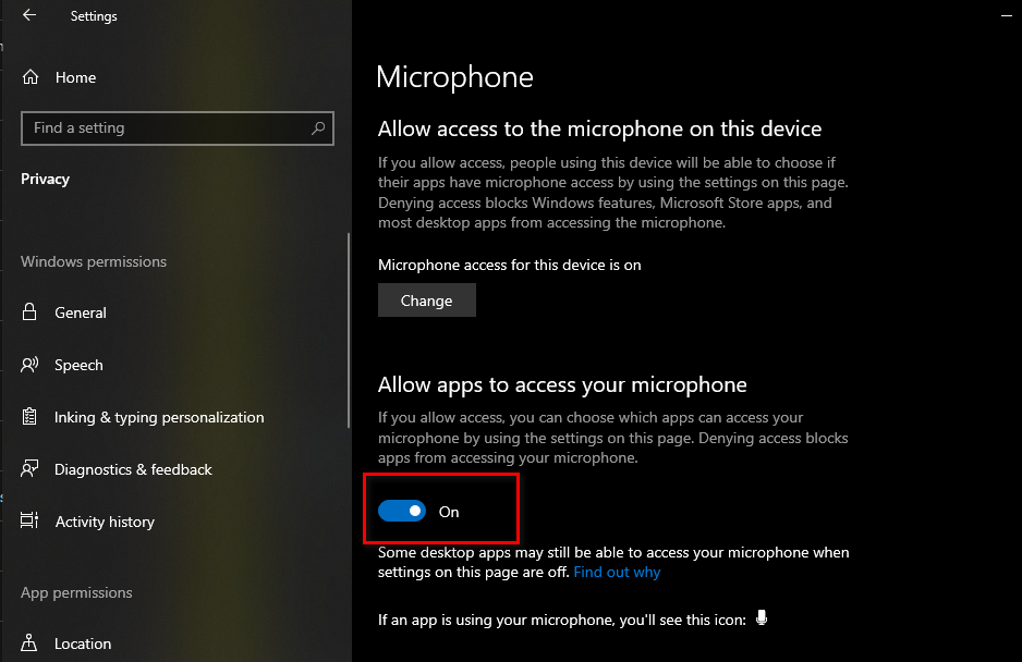 - Once you’re inside the Microphone privacy tab, move over to the right-hand pane and enable the toggle associated with Allow apps to access your microphone.