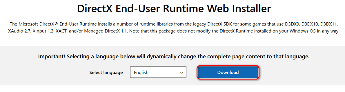 - Download and run the DirectX End-User Runtime Web Installer from Microsoft’s official website.