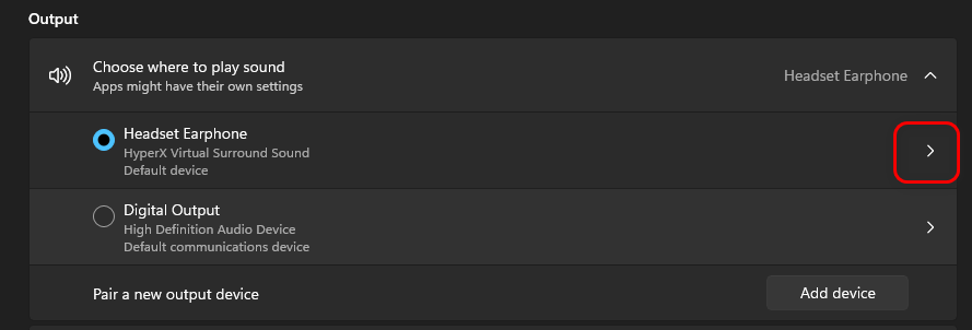 - In the Output section, click the arrow next to your preferred device (for example, your headphones).