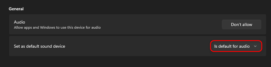 - Under Set as default sound device, choose Is default for audio.