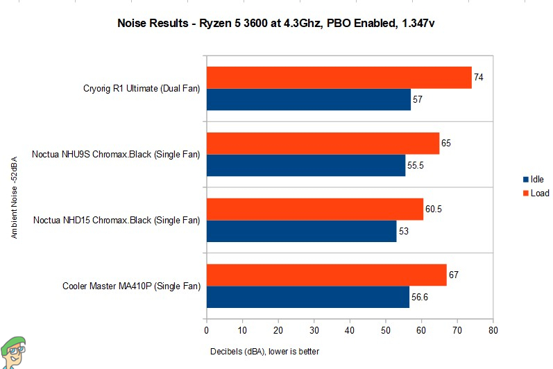 Note: Our ambient noise levels (52dBA) were a bit higher than usual due to our testing environment’s ventilation system. Thus making the noise tests of the cooler seem higher than usual.