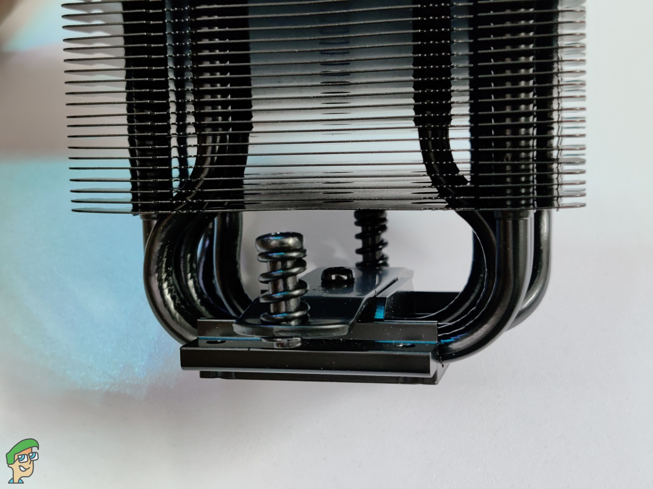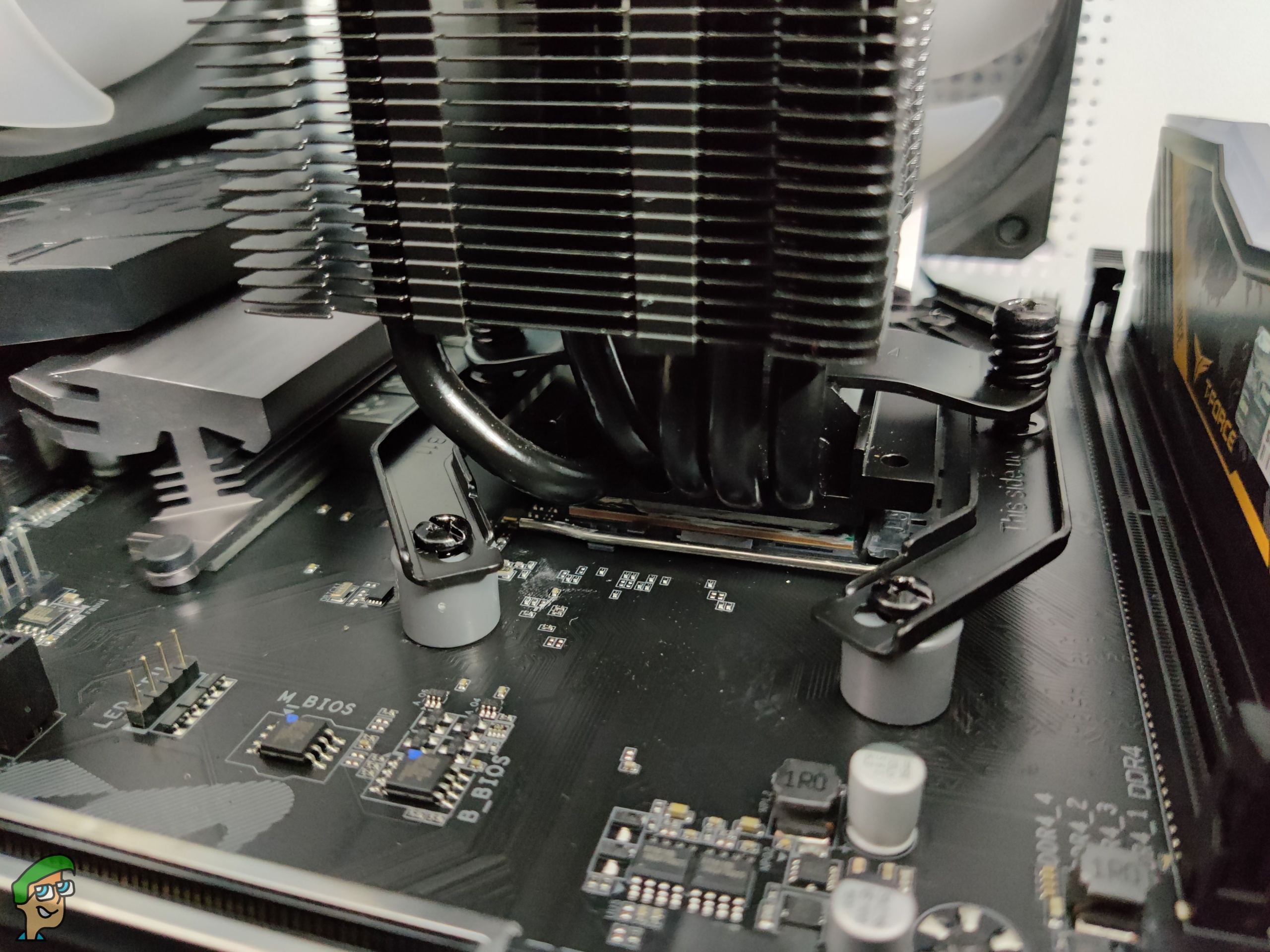 We’ll talk about Intel first. You’ll have to attach the backplate included in the box first. It goes on the back of the motherboard. Next, install plastic spacers and the Intel mounting bars on top of the backplate. Screw the mounting bars securely with the provided thumbscrews. Apply a small amount of thermal paste, line up the cooler, and then just tighten the screws. Last but not least, install the fan and plug in the PWM connector.