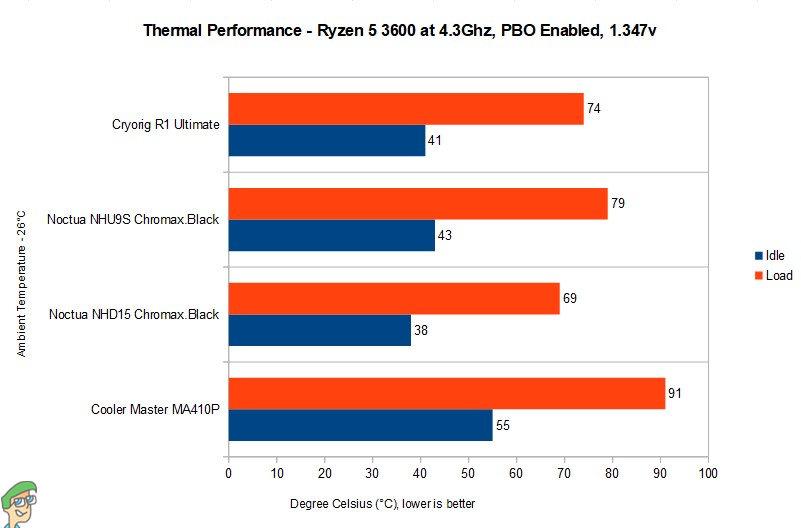 The thermal performance of this cooler was amazing, as expected from Noctua. The NHU9S performed miles ahead of the bigger and “supposedly” better MA410P from cooler master. Our Ryzen 5 3600 was running a bit toasty at (1.347v) on auto OC/PBO mode. Even on dual tower coolers the temperatures were a bit higher for a 65-watt chip, still the NHU9S had zero issues cooling down the processor whatsoever, the results can be seen below.