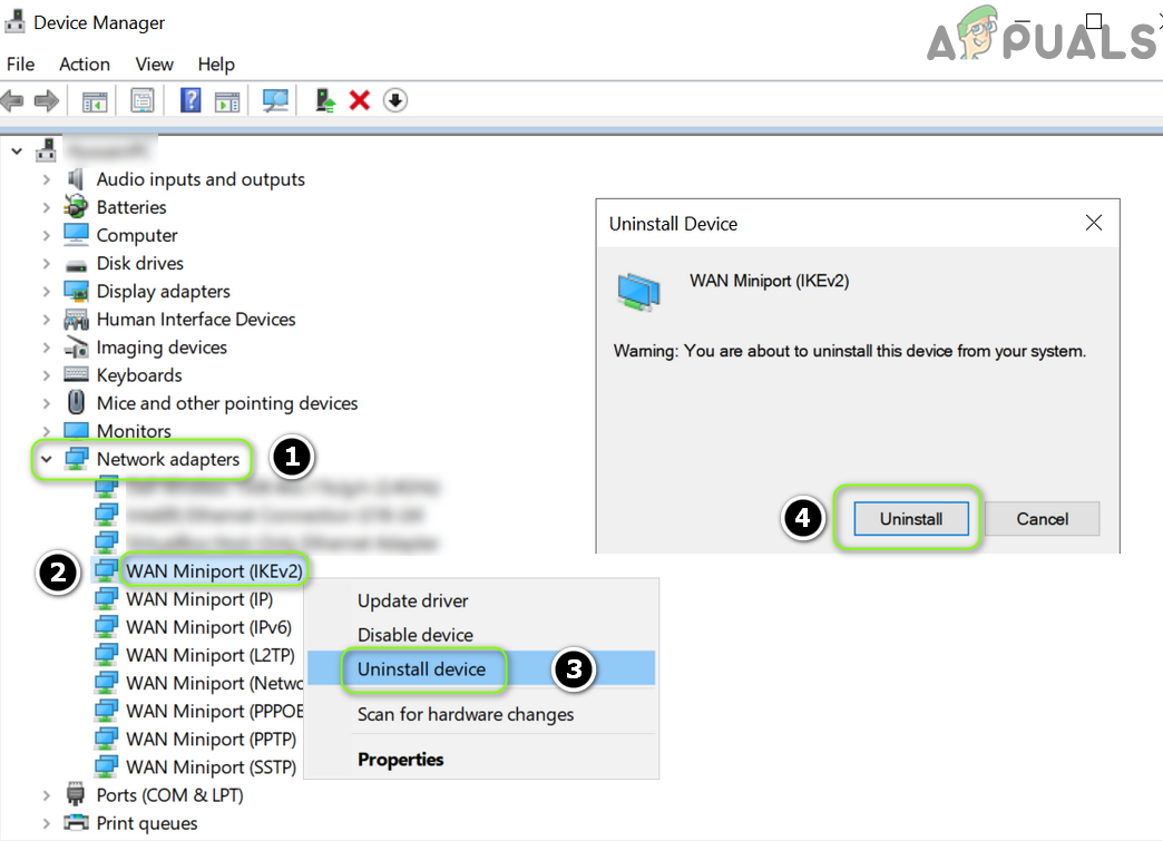 Uninstall WAN Miniport - Then repeat the same to remove all the WAN devices & then right-click on Network Adapters.