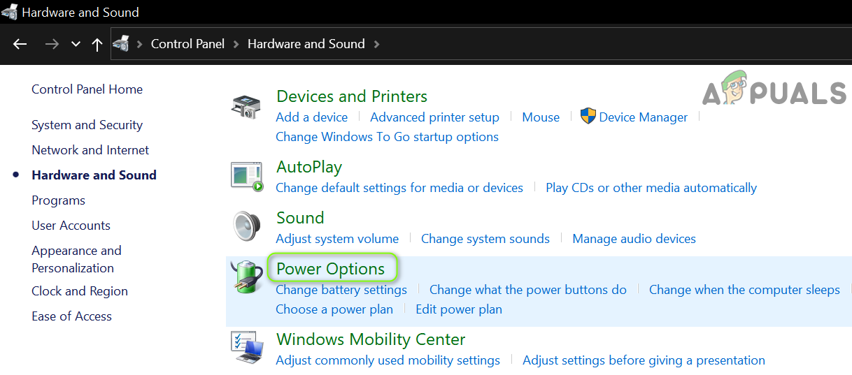 Open Control Panel - Now select Hardware & Sound & open Power Options.
