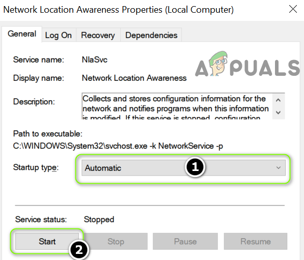 - Now, double-click on the Network Location Service & set its Startup type to Automatic.