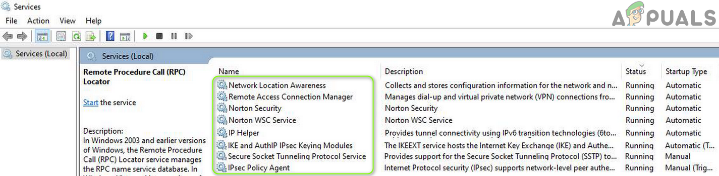 Remote Access Connection Manager Norton Security Norton WSC Service IP Helper IKE and AuthIP IPsec Keying Modules