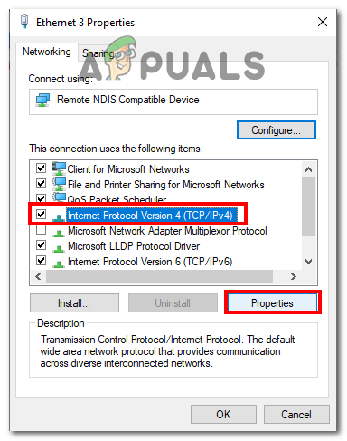 - Select the “Internet protocol version 4 (TCP/IPv4)” and click on the properties button as shown in the image below.