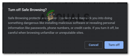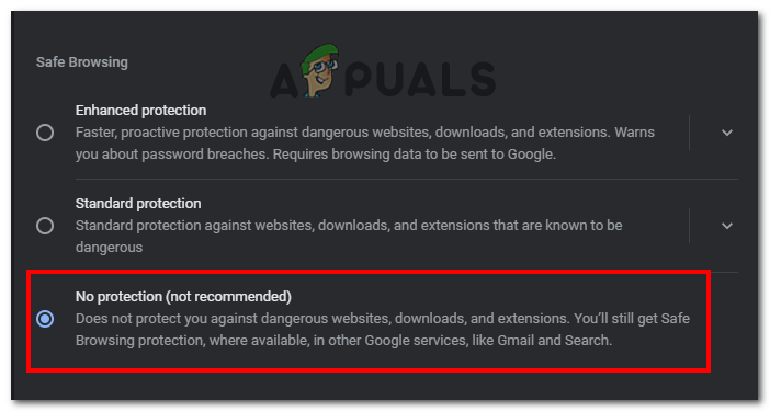 - Now, click on “No protection (not recommended)” under the Safe Browsing section.