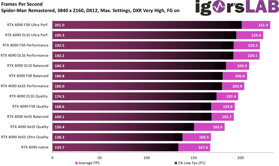 Now, for the main part of today’s topic. Igor’s Lab ran various tests using an i9-12900K an RTX 4090 and DDR5-6000 memory. Starting off with AMD’s FSR, we see the RTX 4090 with FG on pump out 231 frames using the ultra-performance preset in Spider-Man Remastered.