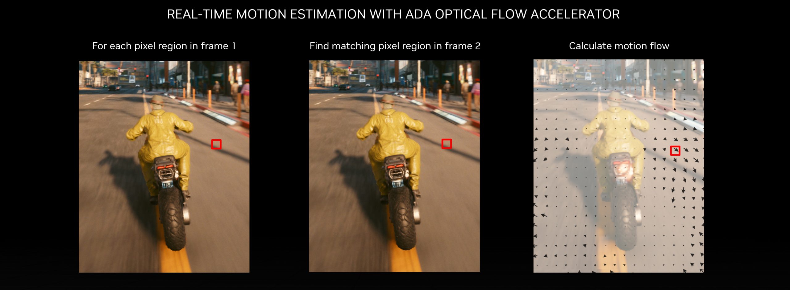 The Motion Vector part on the contrary tracks the 3D environment and the scene geometry. In the same bike example, motion vectors can pinpoint the accurate future position of the biker or the road mathematically. However, they cannot determine the shadow for which Optical Flow Analysis is used. Thus, these two must work in tandem to produce an accurate image.