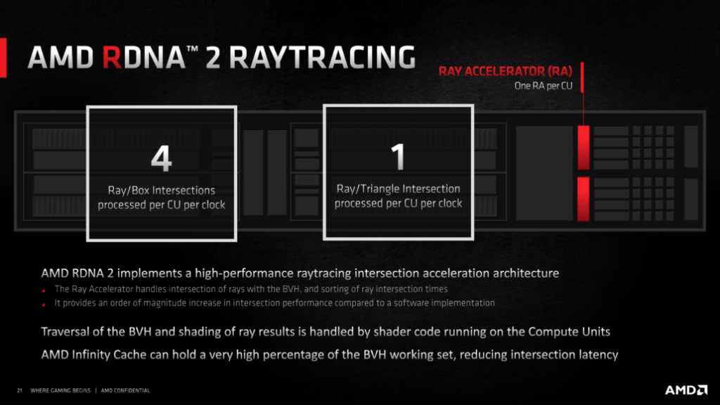 AMD has entered the Ray Tracing race with their RX 6000 series and with that, they have also introduced a few key elements to the RDNA 2 architectural design that help with this feature. To improve the Ray Tracing performance of AMD’s RDNA 2 GPUs, AMD has incorporated a Ray Accelerator component into its core Compute Unit Design. These Ray Accelerators are supposed to increase the efficiency of the standard Compute Units in the computational workloads related to Ray Tracing.
