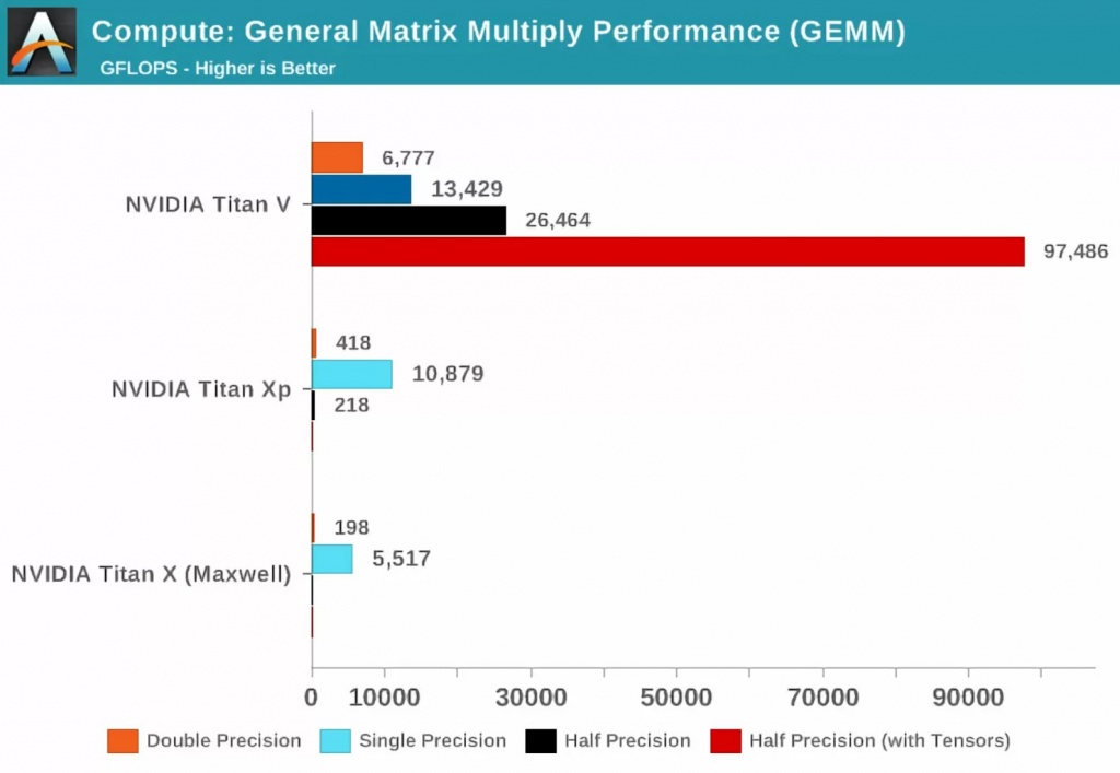 In simple words, Tensor Cores are used to perform extremely complex calculations that will take other non-specialized cores such as CUDA cores an unreasonable amount of time to perform. Due to their specific nature Tensor Cores are clearly excellent at performing this kind of work. In fact, when Volta first appeared, Anandtech carried out some math tests using 3 Nvidia cards. The new Volta card, a top-end Pascal graphics card, and an older Maxwell TITAN card were all thrown in the mix and these were the results.