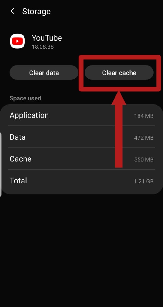 Select “Storage” - A panel showing the YouTube app’s storage details should appear. Press “Clear Cache“. After this, try opening the YouTube app again.