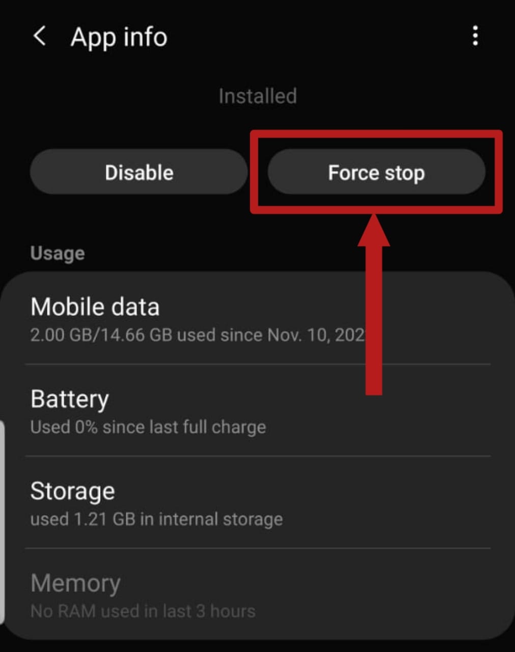 Select “App Info” on the pop-up menu - Press “Force stop” on the menu that appears.