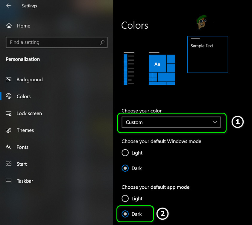 Open Personalization in the Windows Settings - Then expand the drop-down of Choose Your Color and select Custom (you may choose Dark if you want the Apps and Windows to be in the dark mode).