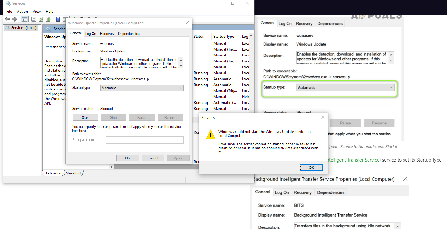 Set the Startup Type of the Windows Update Service to Automatic and Start it - After that, repeat the same for the BITS (Background Intelligent Transfer Service) service to set its Startup type to Automatic and Start it.