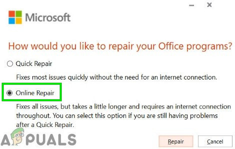 - Then click on the Change button and in the How would you like to repair your Office programs window, select Online Repair.