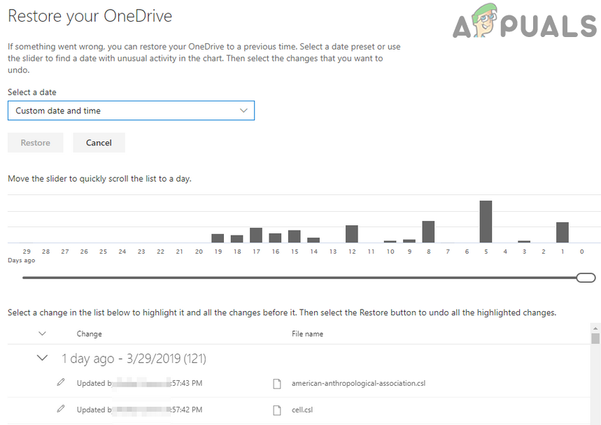 Verify Your Identity to Restore OneDrive - Then, on the Restore Page, select the date you want to revert to and then use the activity chart/feed to review the recent activities that you want to undo.