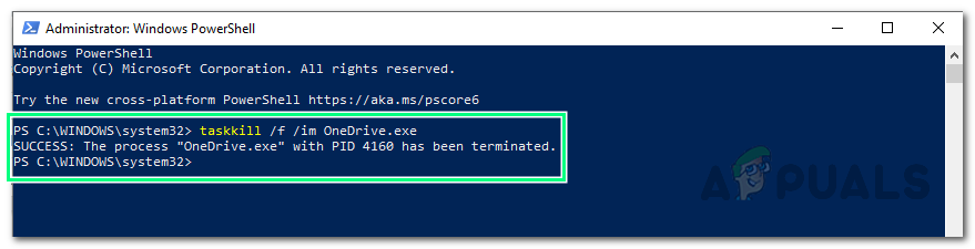 Opening Windows PowerShell as Administrator - Copy-paste the following command in Windows PowerShell and press Enter. It will terminate all the hidden background OneDrive processes of any kind i.e. installation, execution, etc.
