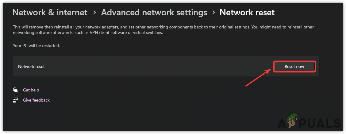 - Click Reset Now to start the resetting process. This will restart your computer with the default network settings.
