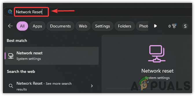 - Type Network Reset in the search bar and hit Enter to open the settings.